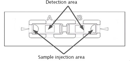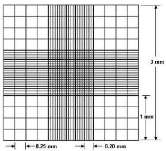 C-Chip (DHC-N01)是用于手工計數(shù)的一次性塑料血球計數(shù)板, 不但能精確的控制體積,而且操作簡單。包括兩個閉合的小室,每個小室有兩個樣品進出口(圖2)。DHC-N01格柵和改良式紐鮑爾格柵很相似。包括九個大格,每個大格為1×1mm ,每格深度為0.1mm。每個大格總體積為0.1mm3或者10-4cm3(圖1)。正中心的一個大格經(jīng)過三重分割又被分成25個小格,四角上的四個大格分別被分成16個小格。