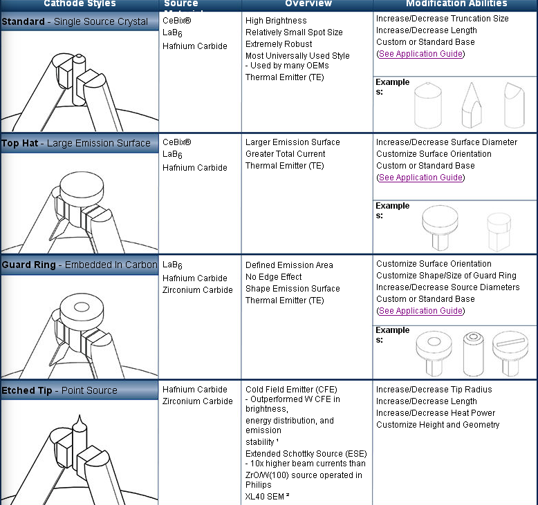 APTECH公司帶給大家四種常見材料的的電子發射源。熱游離發射thermal emission (TE)源有六硼化鑭(LaB6)和六硼化鈰(CeBix®)燈絲兩種;場發射電子槍有兩種:冷場發射式(cold field emission , FE),熱場發射式(thermal field emission ,TF),過渡金屬元素常作為場發射材料,而難熔金屬往往作為冷場發射源。