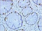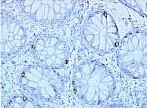 1.福爾馬林固定,石蠟包埋,人乙狀結腸組織切片,經抗原修復鍋進行抗原暴露,R-Buffer C (pH 6.0),組織玻片降溫過夜,抗體MIB-1,抗原Ki-67,R-Detect HRP系統染色