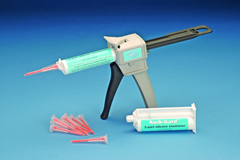 Sylgard 184硅橡膠(Kwik-Gard™Start Up kit)特別適合科學研究應用。可以省去混合兩種膠帶來的麻煩和時間的浪費。當推進注射器時自動在尖部混合,無任何氣泡,直接用于位點。更換尖端就可以重復使用,有效避免了浪費。每針筒含有37ml的硅膠樹脂和固化劑,針筒頭(tip)的體積0.75ml。針筒內的硅橡膠是Sylgard 184,液體組分組成的雙組分產(chǎn)品,包括硅膠組分與固化劑。硅膠組分與固化劑按10:1重量比完全混合,形成中等粘度混合液,混合液將固化成為具有韌性的透明彈性體,硅橡膠在25℃的溫度固化需要24h,無放熱現(xiàn)象,無需二次固化。