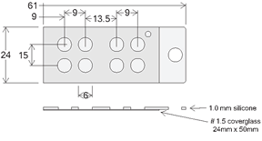 產(chǎn)品由兩部分構(gòu)成:24 mm x 50 mm, #1.5 德國(guó)玻璃蓋玻片;可重復(fù)應(yīng)用的無細(xì)胞毒性的硅膠隔離貼片。