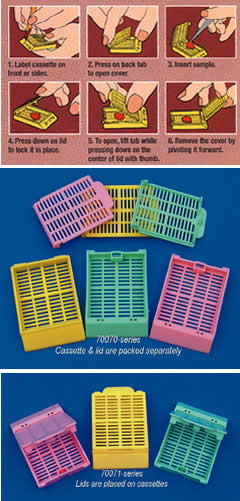 由乙酰基聚合物制作而成,這種特殊的高密度聚合物,能使樣本安全的浸沒在溶液中。包埋盒對大多數組織溶劑有抗性,盒表面柵格能為液體交換提供最大流量、最適排水。蓋子或者附著在包埋盒上,或者獨立包裝。根據使用需求蓋子能夠隨時開、合,隨時安全鎖定,不會損傷樣本。包埋盒三面均有較大的空白標記區域,方便使用。