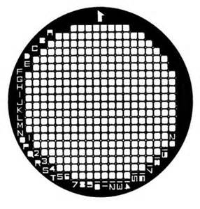 l 200目F2型坐標載網:粗的柵條分割出小的區域,每小區域內是細柵條組成的9個孔,每一區域對應一個字母編碼。