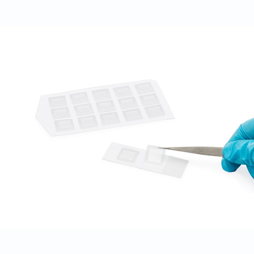 細胞培養(yǎng)時,下層的硅膠片可以牢固吸附培養(yǎng)器皿的表面,而上層的蓋玻片與硅膠片也牢固貼在一起,避免了培養(yǎng)過程中蓋玻片的移動。培養(yǎng)完畢進一步實驗也變得簡單快捷,帶有硅膠底片的蓋玻片,直接貼于載玻片上進入下一步實驗,或者倒扣在滴有溶液的載玻片上,硅膠片在上層作為蓋片防止溶液的蒸發(fā)。