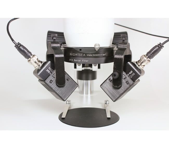 燈使用上可選的配件:燈頭吊架和電纜線。如果覺得鵝頸燈的角度滿足不了自己的需求,可以購買吊架和電纜線,吊架可安裝到SFA適配圈上任何一個螺釘的末端。燈頭吊架有兩個不同的樞軸臂長度,用于長和短的工作距離。從鵝頸上移除燈頭,裝入吊架,并將其安裝在SFA適配圈上,用電纜線直接連接燈頭和燈座。其實可以一個燈座連接雙線電纜,安裝兩個燈頭和兩個吊架,你就有雙倍的激發強度。